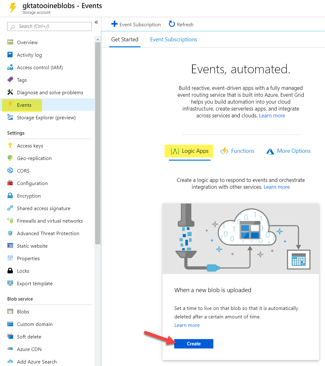 - Go to your storage account click on Events and Create the Logic App for “When a new blob is uploaded“