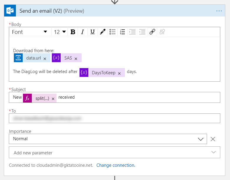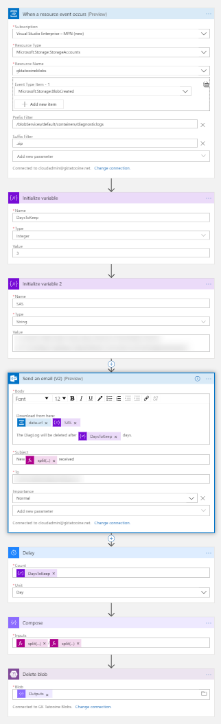 Managed to set this up and make it work in a lab to the point that I get the email when the log package is uploaded to the blob. But I’m struggling with the Compose part of the sequence that should be chained to the delete blob, looks like you have two (split) expressions there in the picture? Any hints would be appreciated. 🙂