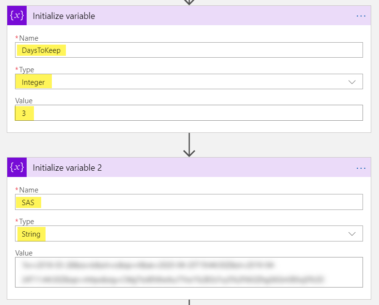 - Add two variables for later usage, DaysToKeep and SAS for a SAS signature (generated in the same way as for the DiagnosticLog CSP – learn more about SAS here ‘Using shared access signatures (SAS)‘). This time we need it in the following form like bellow. This is needed to append to the download URL to get access to the DiagLog blob: